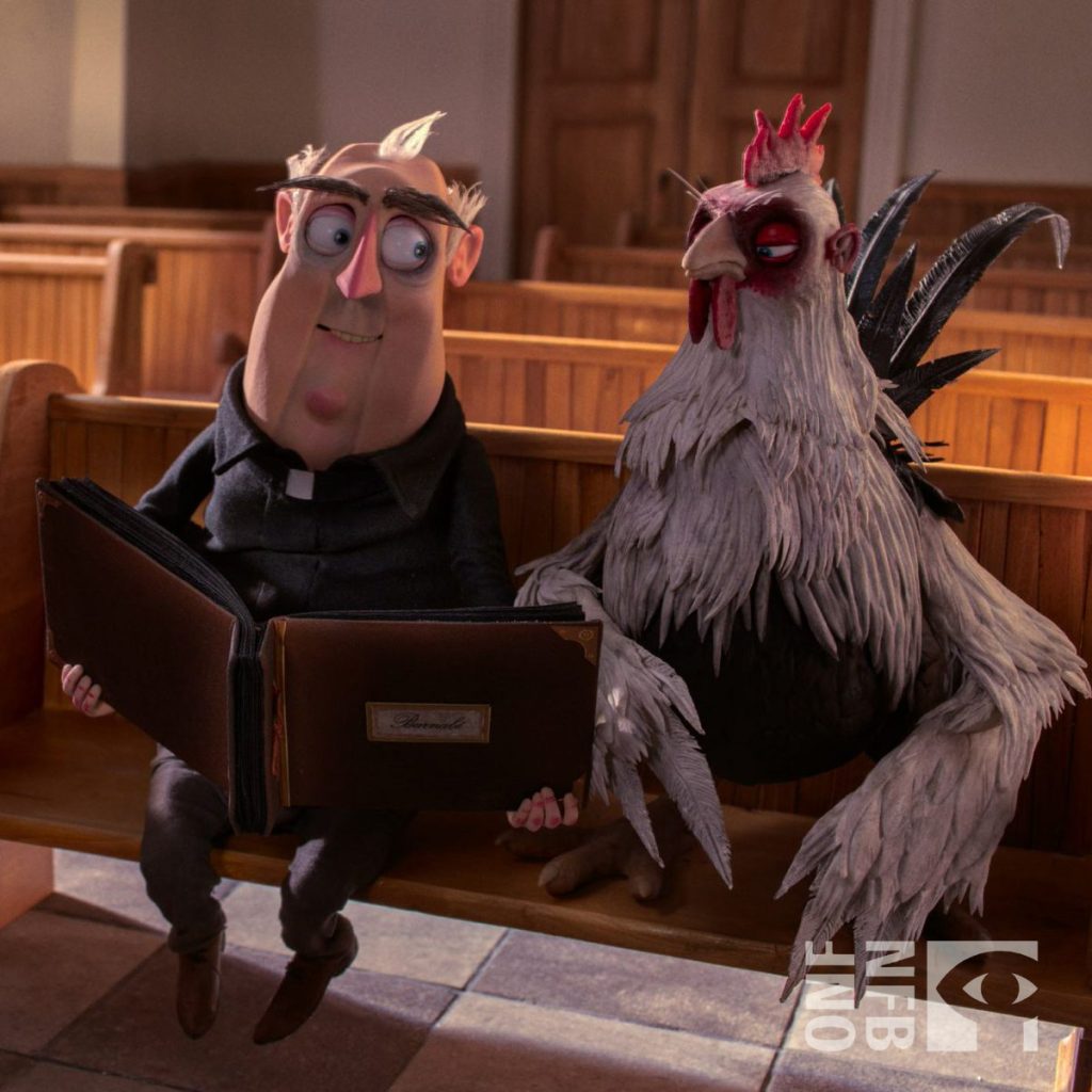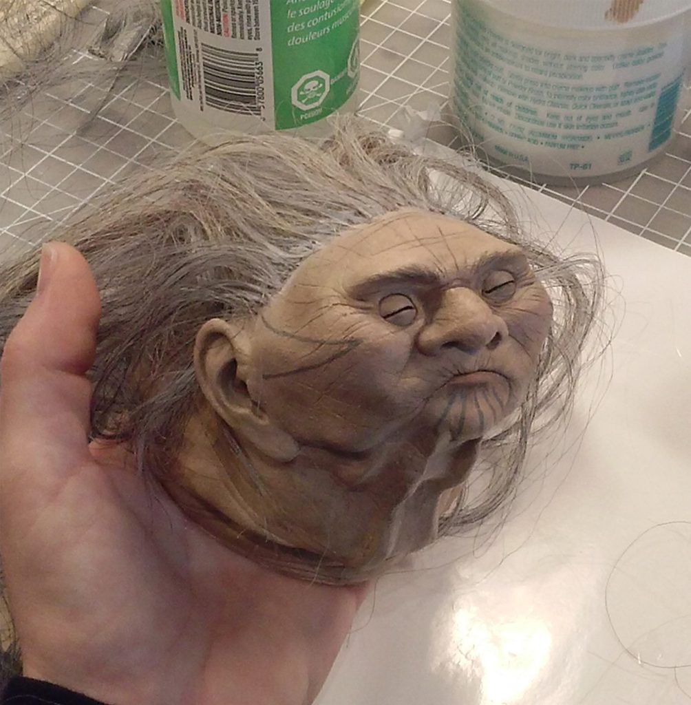 I made the production molds, silicone casting, foam latex casting (for Barnabe only), plus ball & socket head mechs and eyes for the three transitional rooster puppets. Silicone painting, tail feather fabrication, and body assembly. All sculpts were resin prints provided by JF Levesque (Director), Facial armatures/face casting for Barnabe: Jim Randall. Body armatures: Eric Goulet, Costume: Ally Easson